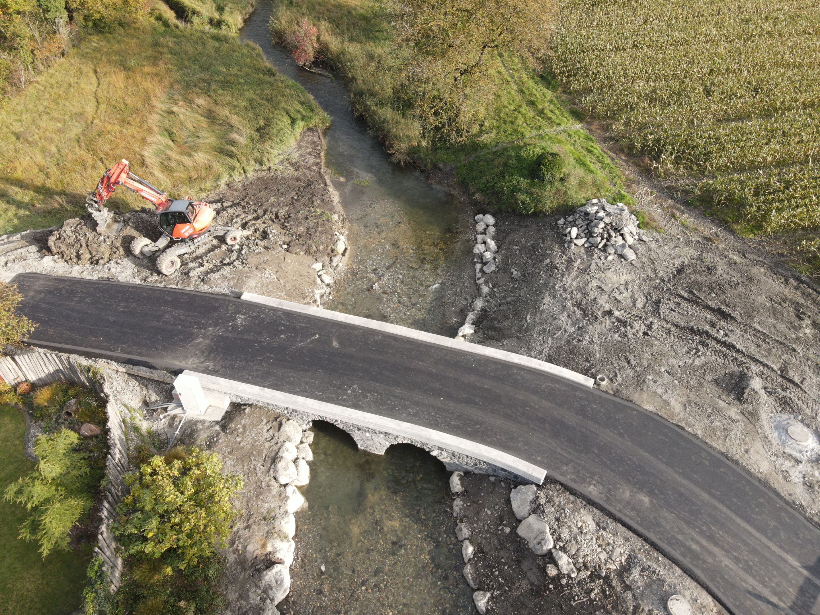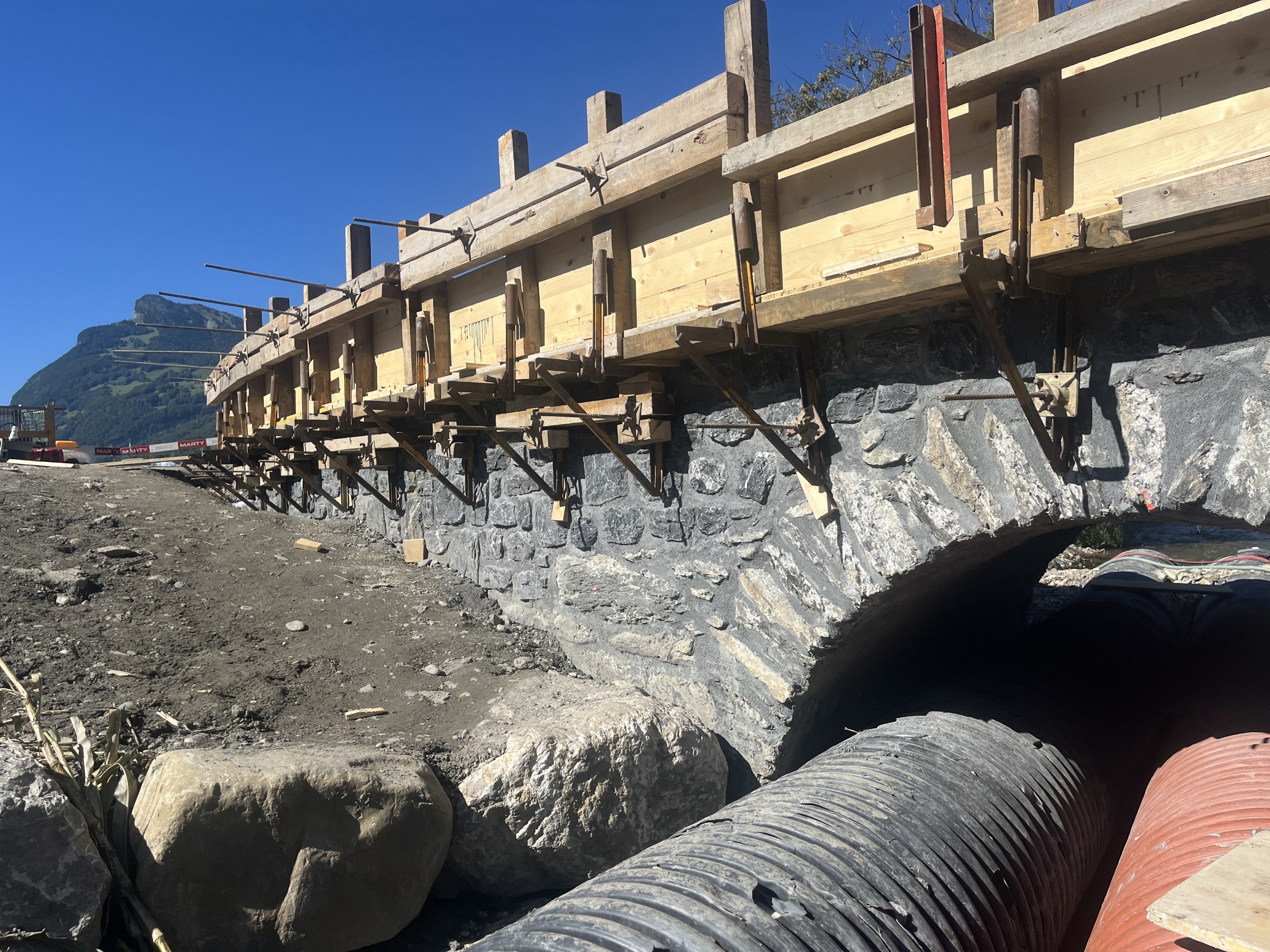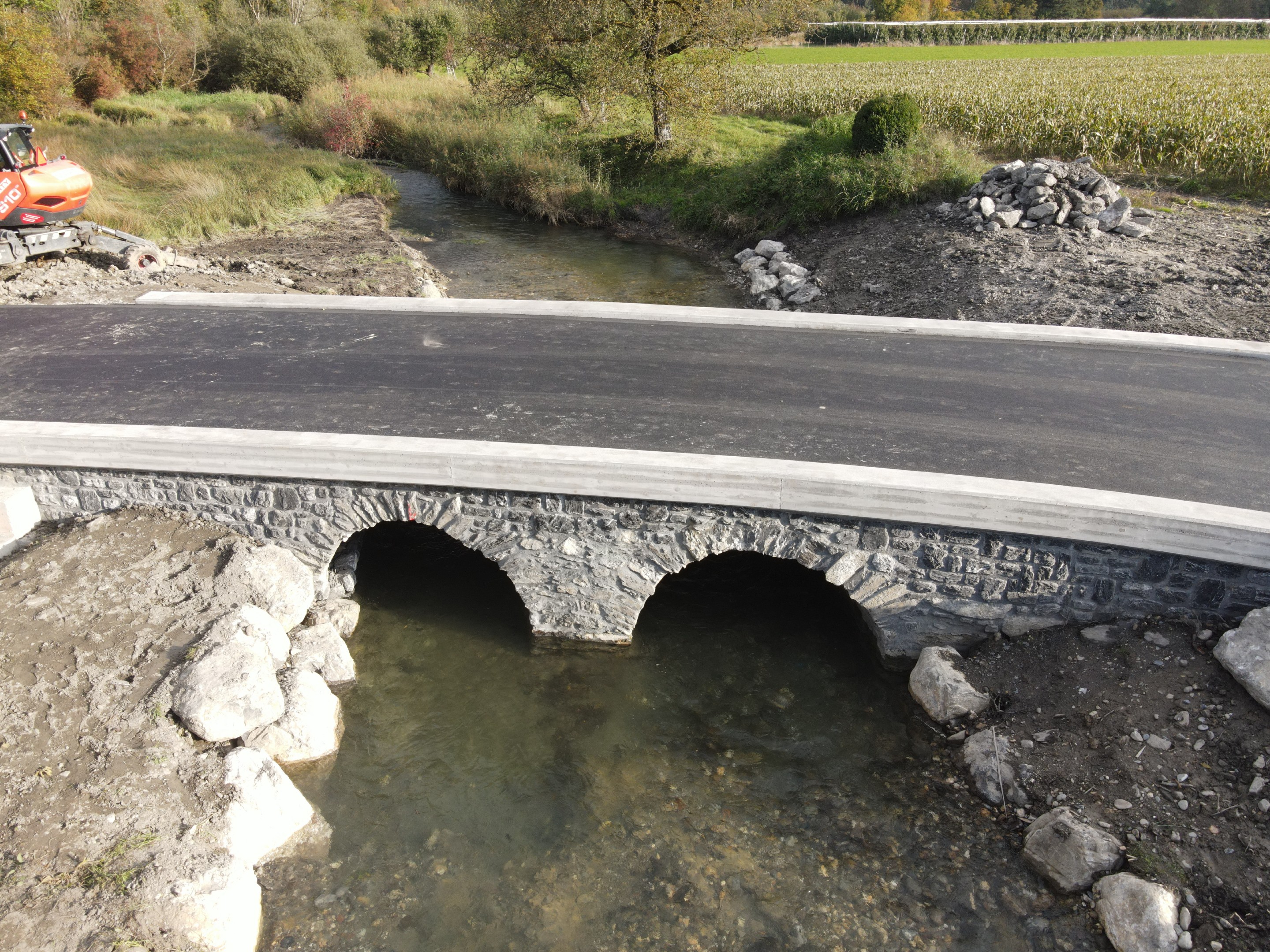 Die Neumülibrücke, eine rund 15m lange, zweifeldrige Natursteinbogenbrücke mit einer Bogenspannweite von 3m, wurde im Zuge der umfassenden Instandsetzungsmassnahmen in den Rheinauen Wartau saniert. Die Brücke zeigte erhebliche bauliche Mängel, insbesondere im Bereich der Widerlager und Flügelmauern, die eine vollständige Sanierung erforderlich machten. Im Zuge der Brückensanierung wurden die an der Brücke aufgehängten Werkleitungen in einem konventionellen Graben unterhalb der Bachsohle verlegt.