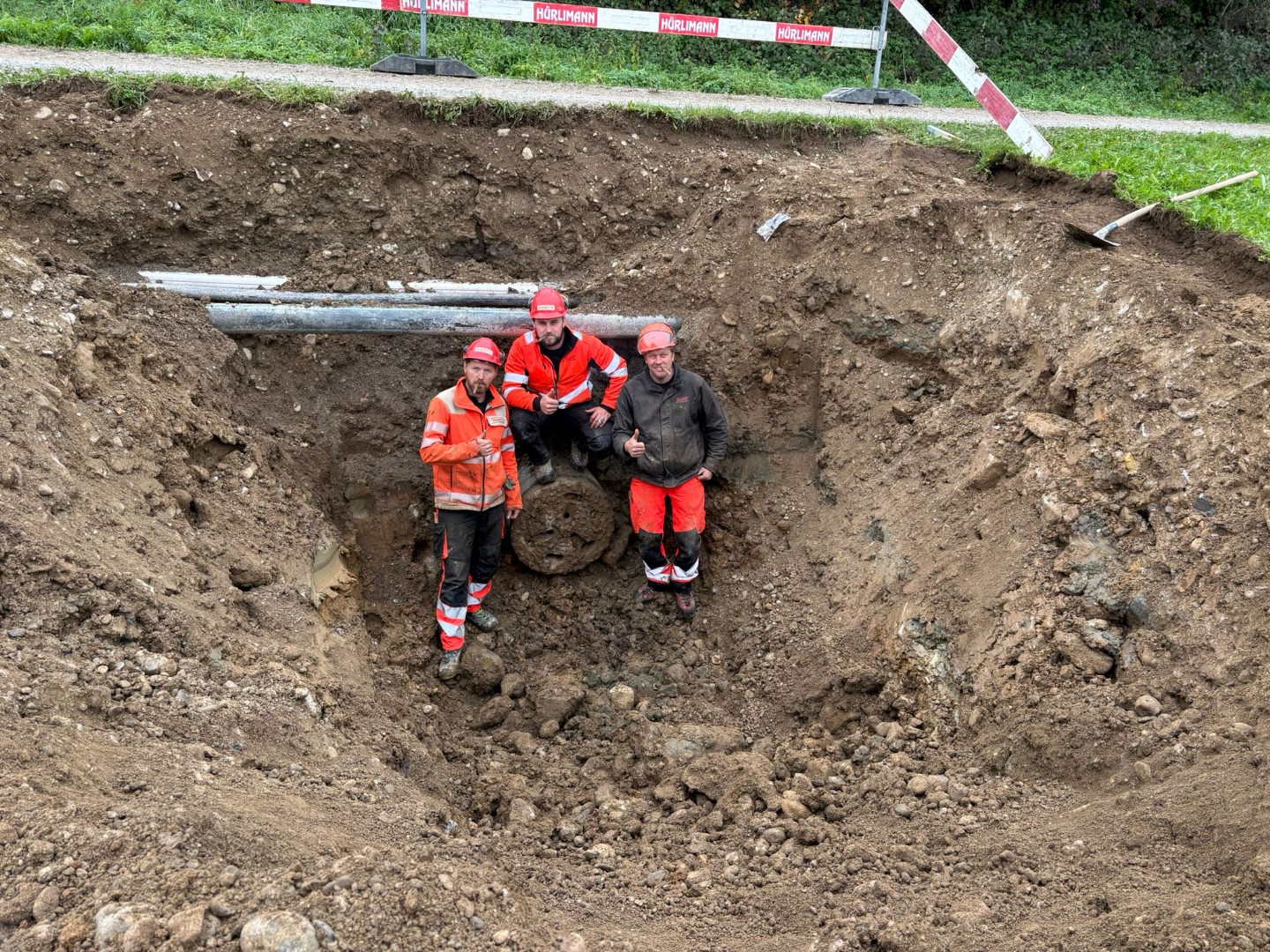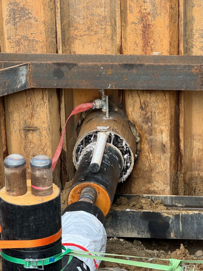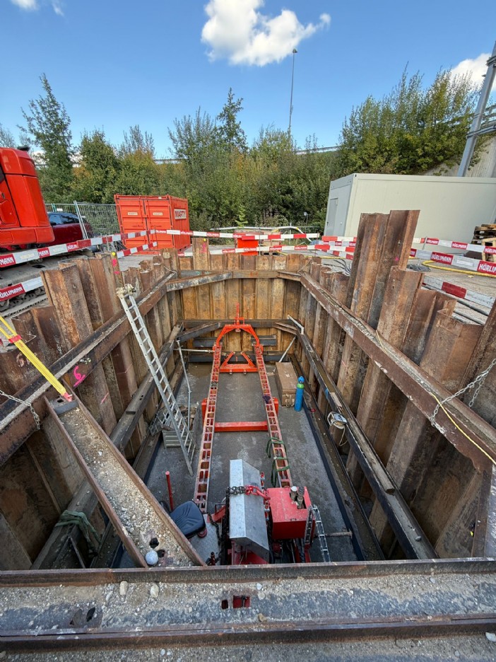Im Rahmen des Projekts der RWT Regionalwerk Toggenburg AG wird in der Gemeinde Jonschwil ein rund 4,5 km langes Fernwärmenetz realisiert – ein wichtiger Schritt hin zu einer nachhaltigen und effizienten Energieversorgung in der Region. Für dieses Infrastrukturvorhaben führten wir einen anspruchsvollen Pressbohrvortrieb aus, welcher die sichere Querung einer Autostrasse sowie der Bahnlinie und eines Gewässers erforderte. Mit unserer Pressbohranlage konnten wir ein Stahlrohr DN 610 über 102 m bei leichtem Gefälle erfolgreich mit unserem System mit sehr hoher Genauigkeit und grosser Geschwindigkeit pressbohren. Die geologischen Bedingungen – insbesondere der kiesige Untergrund – stellten hohe Anforderungen an Präzision und Maschinentechnik. Durch den Einsatz unseres teilweise selbst entwickelten Systems des richtgesteuerten Pressbohrvortriebs mit Imlochhammer und Echtzeitvermessung wurde eine präzise Steuerung und maximale Sicherheit gewährleistet. In diesem Untergrund erreichen wir mit dieser Maschine eine neue Bestmarke. Die Arbeiten erfolgten in enger Abstimmung mit der Bauherrschaft und den Fachplanern sowie unter sorgfältiger Berücksichtigung aller örtlichen Gegebenheiten, bestehenden Werkleitungen und geologischen Randbedingungen.