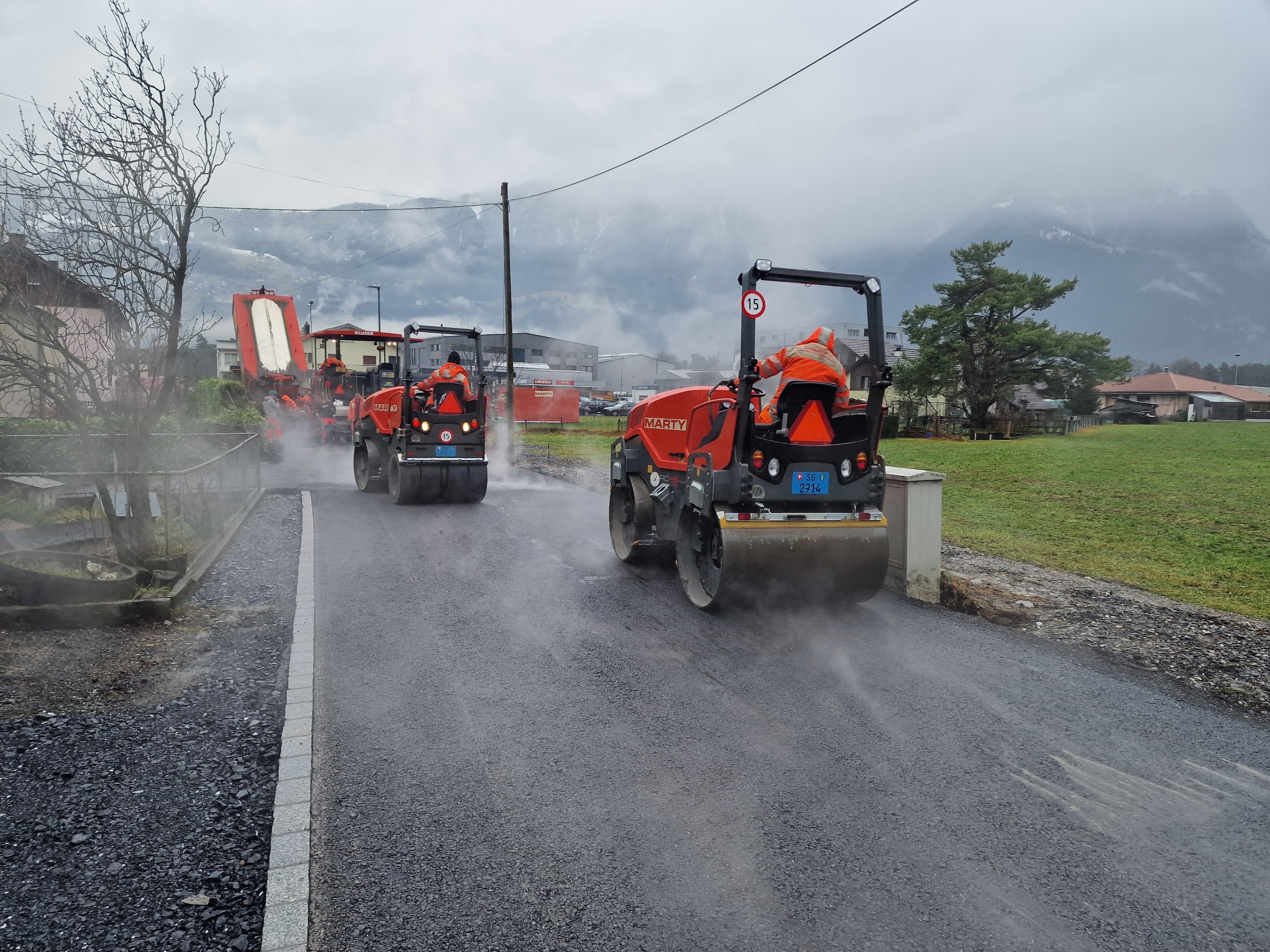 Strassenbau: Belagsaufbruch ca. 1'300m², Ausbau auf durchgehende Fahrbahnbreite von 4.70m, Neuer Strassenoberbau mit Asphaltbelägen (420to), Randabschlüsse auf 275m.