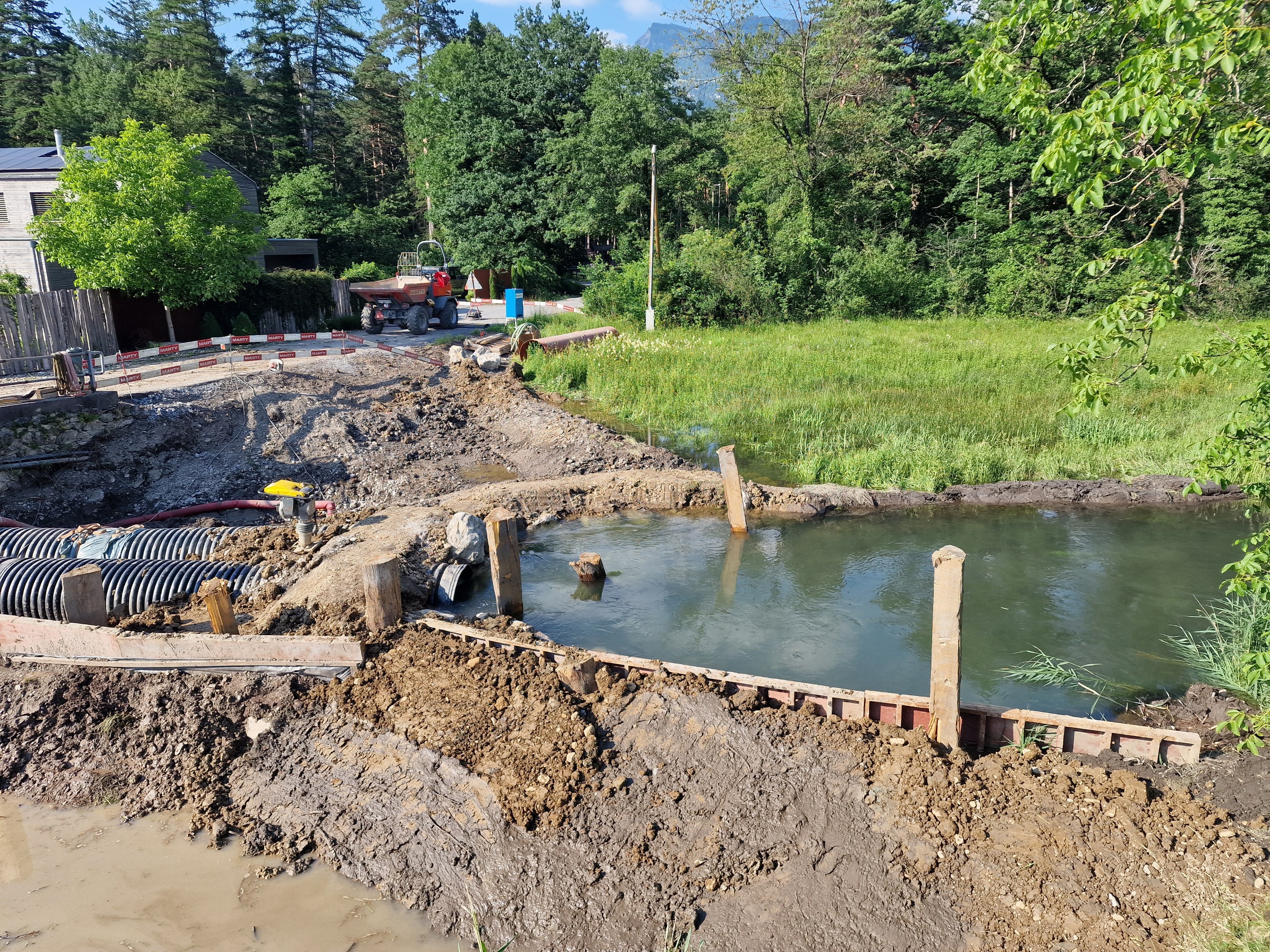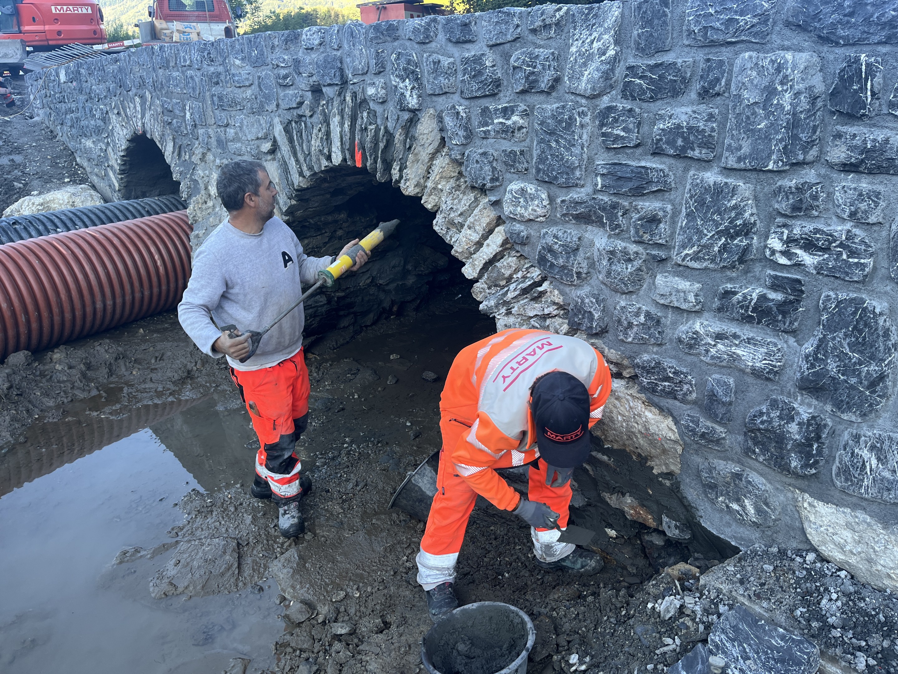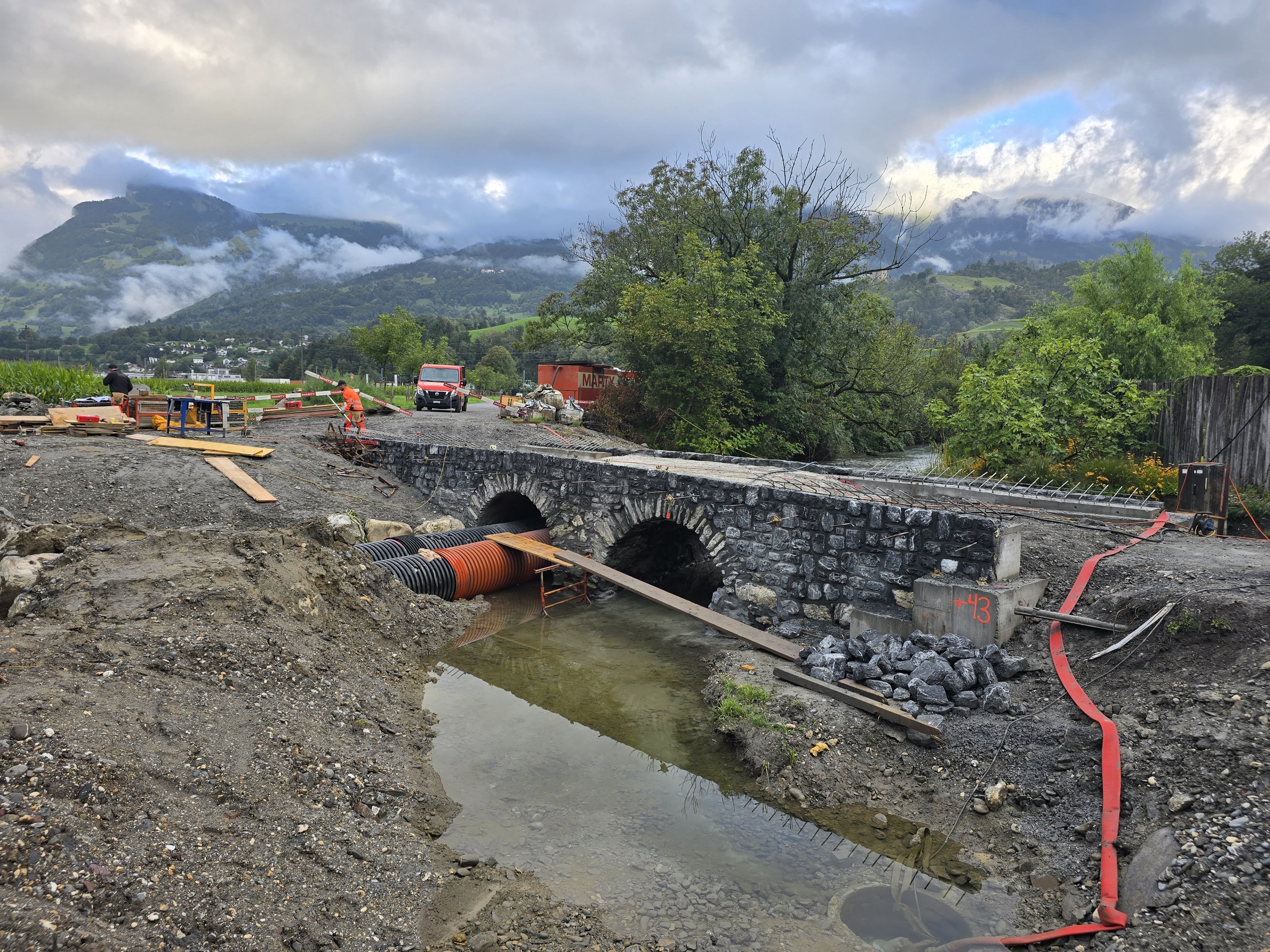 Die Neumülibrücke, eine rund 15m lange, zweifeldrige Natursteinbogenbrücke mit einer Bogenspannweite von 3m, wurde im Zuge der umfassenden Instandsetzungsmassnahmen in den Rheinauen Wartau saniert. Die Brücke zeigte erhebliche bauliche Mängel, insbesondere im Bereich der Widerlager und Flügelmauern, die eine vollständige Sanierung erforderlich machten. Im Zuge der Brückensanierung wurden die an der Brücke aufgehängten Werkleitungen in einem konventionellen Graben unterhalb der Bachsohle verlegt.