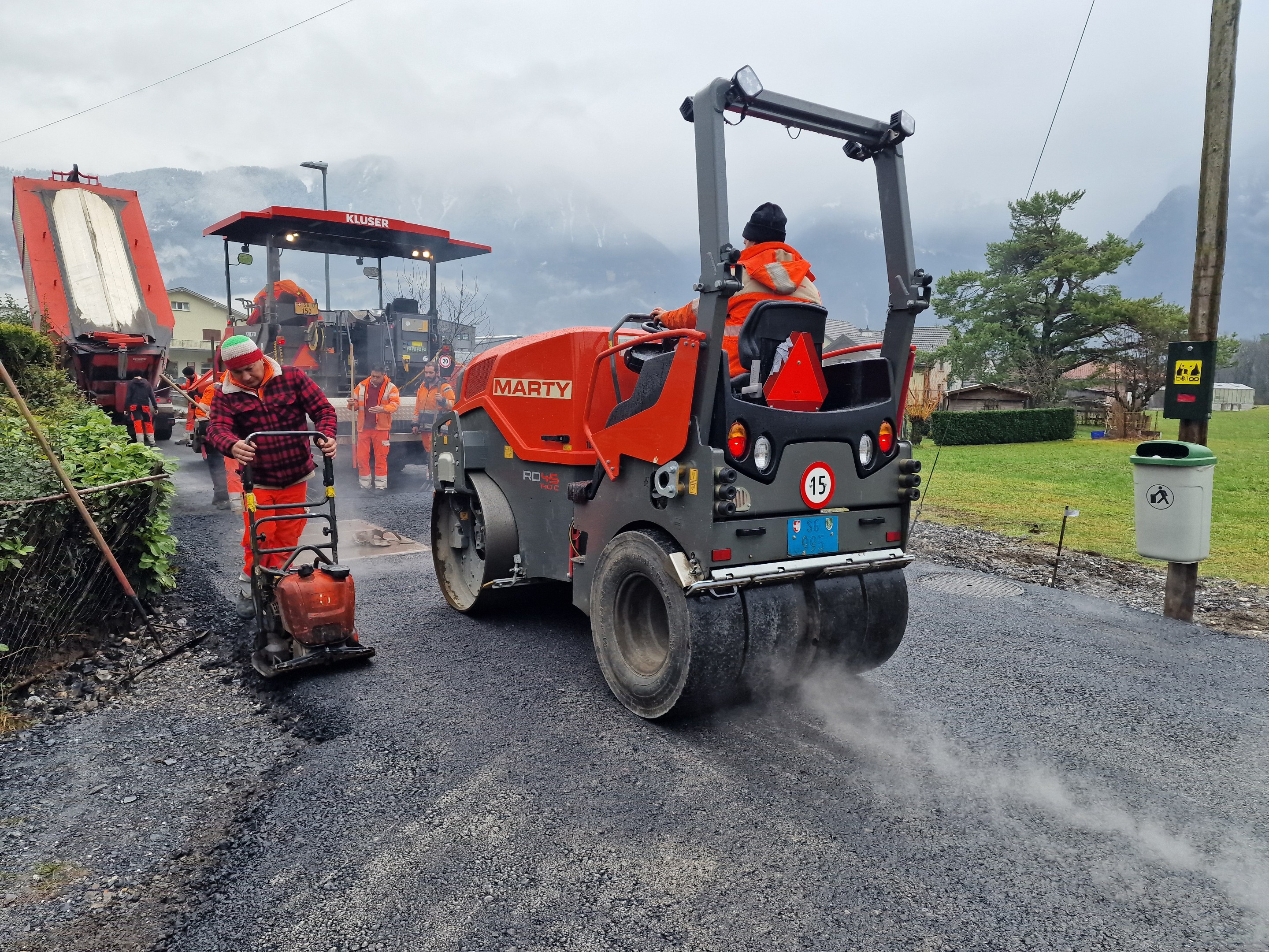Strassenbau: Belagsaufbruch ca. 1'300m², Ausbau auf durchgehende Fahrbahnbreite von 4.70m, Neuer Strassenoberbau mit Asphaltbelägen (420to), Randabschlüsse auf 275m.